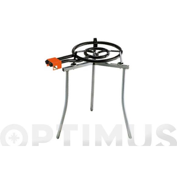 Uso gas butano y propano. Agujeros superiores. Mandos aluminio. Trípode soporte univ. plegable. Regulable en altura p/quemador ø 30-60 cm.