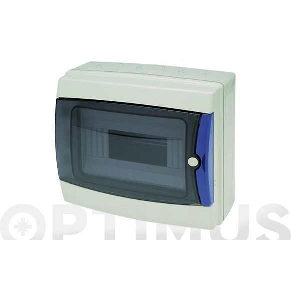 Estanco, aislante, libre de halógenos. IP65. Puerta transparente, carril DIN. 8 elementos.