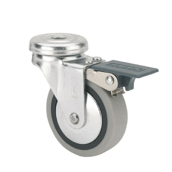 Rodamiento bolas. Núcleo de poliamix y banda de goma gris. Cojinete liso. Norma EN-12528. ø 60 mm. Soporte con freno. 25 kg.