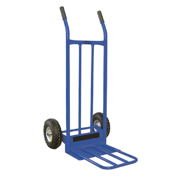 Estructura metálica reforzada pintada epoxy. Base fija con plataforma extensible. Ruedas de goma. Carga máx. 350 kg. Rueda ø 260 mm.