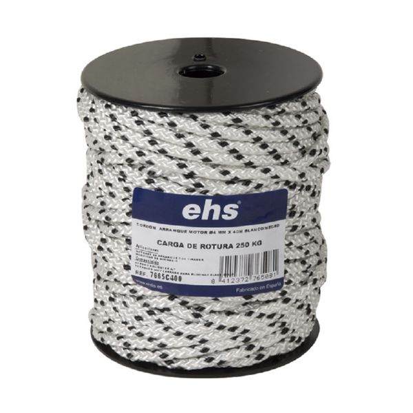 Cuerda poli?ster trenzada alta tenacidad. Compuesto anti-UVA. Color blanco/negro. Aplicaciones: motores de arranque por tirador. Bobinas retractilada. ? 4 mm x 40 m.