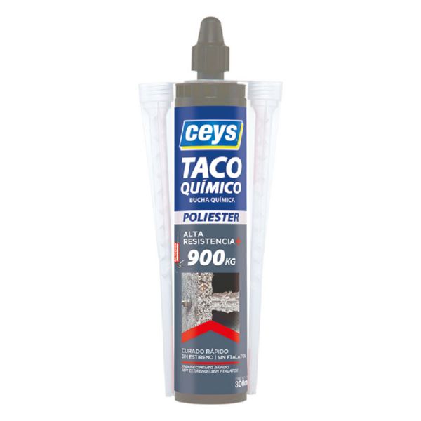 Resina de poliéster. Máxima resistencia sobre todos los soportes huecos, frágiles y compactos. Alta resistencia de carga, hasta 900 kg. (poliéster). Sin estireno ni ftalato. Secado rápido. 300 ml.