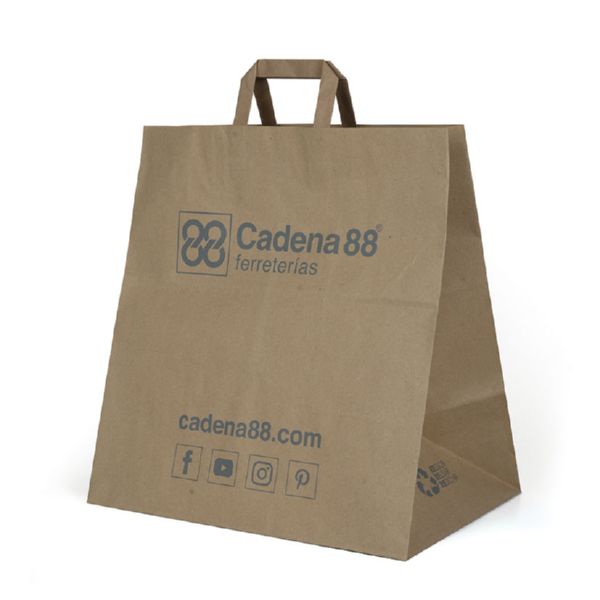 Papel krafft reciclable, gramaje según formato. Impresa con tintas ecológicas al agua. Bolsa grande ancha 24x38xh.40 cm. 200 bolsas.