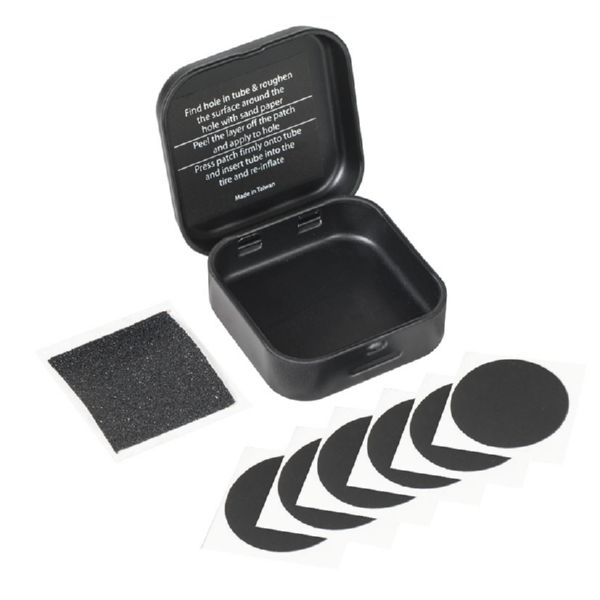 Miniestuche metálico con 6 parches autoadhesivos ø 25 mm + 1 lija. Caja display 10 unidades.