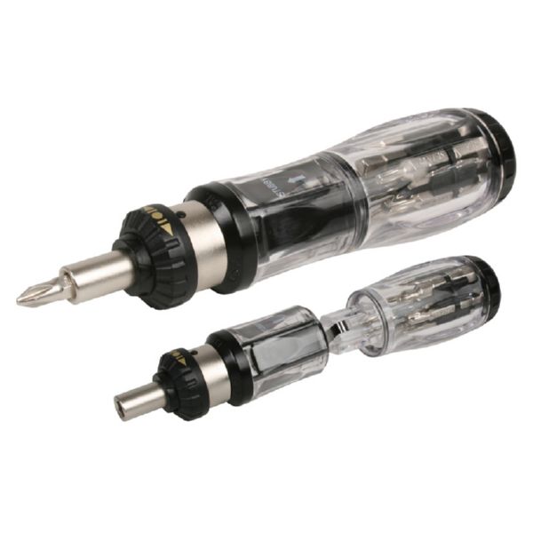 Destornillador múltiple con carraca reversible. Portapuntas magnético. Diseñado para trabajar como un destornillador standard o carrocero con carraca. Depósito portapuntas en el mango. Caja display 6 unidades. Composición: 4 Phillips: Nº 0-1-2-3 / Planas: 4-5-6 mm / 3 Allen: 3-4-6 mm / 3 Torx: T15-20-25 / 1 adaptador de puntas 60 mm.