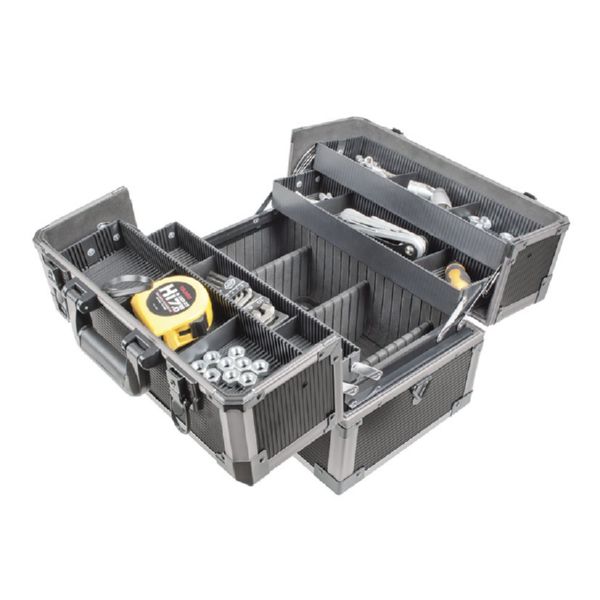 Estructura ligera PVC/Aluminio. Esquinas exteriores metálicas reforzadas. Cierres metálicos. Interior acolchado. Empuñaduras antideslizantes. 36x22,6xh.25 cm. 4 bandejas cantilever con separadores ajustables. 3 separadores ajustables para la caja inferior. 2 cierres metálicos con llave. Correa de transporte ajustable.