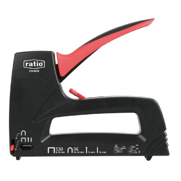 Armazón plástico alta resistencia. Regulador de potencia. Sistema de bloqueo y seguridad en maneta. Ergonómica y confortable. Incluye 200 grapas 530 (12 mm),100 grapas cable (12 mm), 100 puntas con y sin cabeza (16 mm). Grapas 530 (8-14 mm). Grapas cable 36 (12-14 mm). Punta con y sin cabeza 1,2 mm x long. máx. 16 mm.
