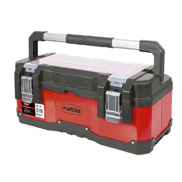 Plástico y metal. Cuerpo de acero con recubrimiento pintura electrostática. Cierres metálicos alta resistencia. Tapa transparente parte superior y 6 cubiletes extraíbles interior. Asa aluminio empuñadura goma. Bandeja extraíble y hueco para candado. Dimensiones: 58,5x28,8xh.25,5 cm.