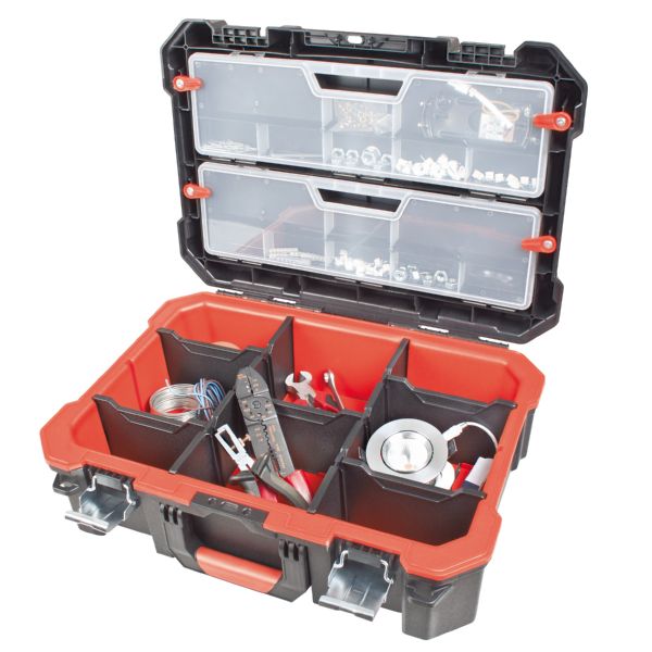 Estructura polipropileno/polietileno. 2 estuches organizadores integrados en tapa interior (6 separadores removibles cada uno). Cubeta inferior con 2 separadores largos y 5 separadores cortos. Cierres metálicos y hueco para candado. Empuñadura ergonómica antideslizante. 49,5x39xh.19 cm.