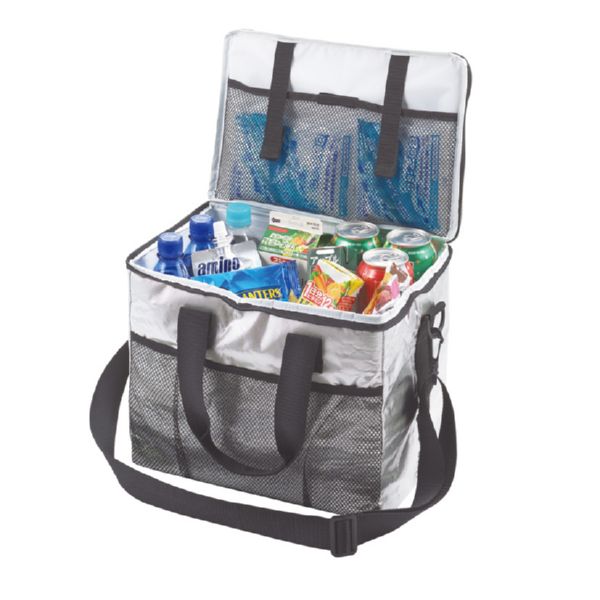 Tejido exterior reflectante. Malla frontal e interior. 15 l. 33,5x24xh.26 cm. x4 botella de 2 l.