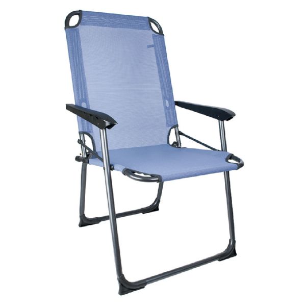 Estructura de aluminio pintado gris oscuro. Asiento y respaldo en textilene color azul. Medidas sillón: 58x68xh.95 cm. Medida plegado: 58x8xh.71 cm. Medida asiento: 48,5x45,5 cm. Altura brazos: h.58 cm. Altura asiento: h.43 cm. Peso máx. 120 kg.