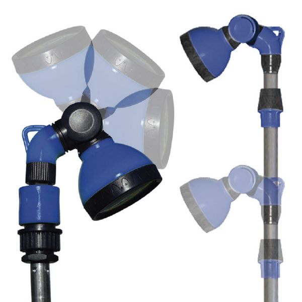 Con tripode. Estructura de aluminio de alta calidad, plástico ABS. Ligera y manejable. Cabezal orientable. Incluye llave de corte que permite regular el caudal. Altura regulable: 1,30 - 2,10 cm. 3 soportes para clavar en césped.