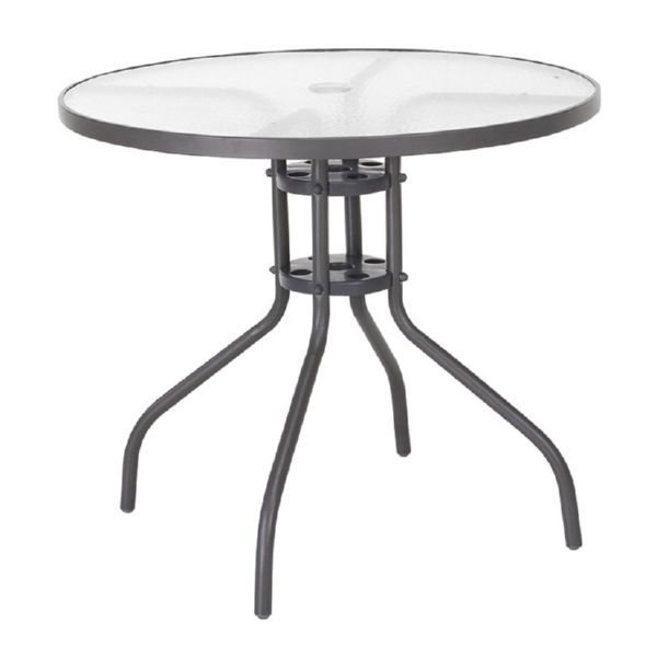 Fibra sintética trenzada/estructura metálica. Color gris antracita. Mesa acero/vidrio. ø 80xh.71 cm. Agujero para colocar la sombrilla: ø 45 mm.
