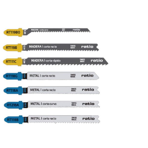 Set básico 10 sierras para corte de maderas, contrachapados, tableros de fibra, chapas metálicas, finas y semigruesas. 2 sierras RT119BO. 2 sierras RT119B. 2 sierras RT111C. 1 sierra RT118G. 1 sierra RT118A. 1 sierra RT218A. 1 sierra RT118B.