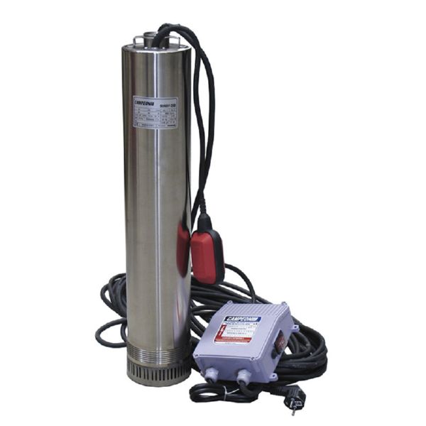 Condensador externo. 4 turbinas. 20 metros. Cable. Peso 14 kg. Filtro desechos en acero inox. Potencia absorbida: 750 W. Caudal máx. 7.800 l/h. Atura máx. 43 m. Profundidad máxima inmersión: 20 m. Dimensiones: 23x14xh.54 cm.