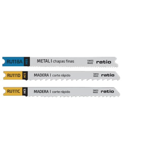 Para madera y metal. Tipo corte: básico/recto Grosor corte: 1,1-1,5 mm. Hoja HCS: RU111C 92 mm/RU111D 92 mm/RU118A 80 mm. Paso diente: RU111C 3,0 mm/RU111D 4,0 mm/RU118A 1,1-1,5 mm. 2 sierras RU118A. Cahapas finas (1-3 mm). 1 sierra RU111D. Madera blanda (5-65 mm). 2 sierras RU111C. Madera blanda (4-50 mm).