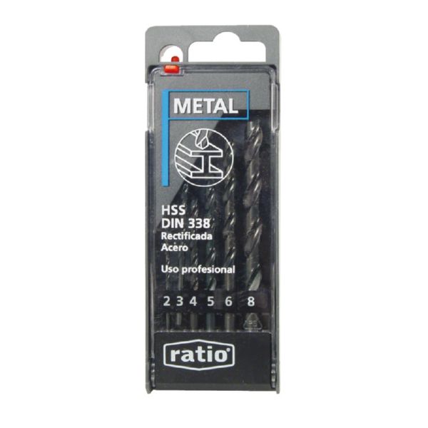 Acero rápido (HSS). DIN 338N, geometría corte rectificada. Calidad profesional. Petaca plástico. Estuche 6 brocas. ø 2-3-4-5-6-8 mm.