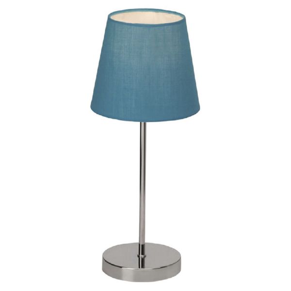Estructura metal cromado/textil. IP20. Clase II. Encendido y apagado táctil. 1 rosca E14 (lámpara no incluida). 16x16xh.40 cm. Pantalla azul. 1xE14.