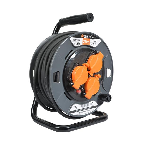 3 tomas con tapa, T/T lateral. Cable H05RR-F 3G1,5. Interruptor de protección térmica. Potencia máxima admisible cable desenrollado 3.000 W. Cable enrrollado 1.000 W. Tensión 13A/230V. Carrete de plástico. Soporte metálico. 25 m.