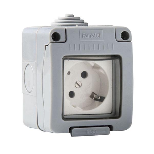 Color gris. IP55. Membrana protectora que garantiza una perfecta estanqueidad. Base enchufe TT lateral.