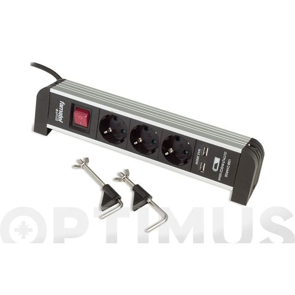 Con soporte sobremesa. Cable 1,5 m. T/T lateral. 16 A. 250 V. Potencia máx. 3.680 W. . 2 entradas USB. 3 tomas.