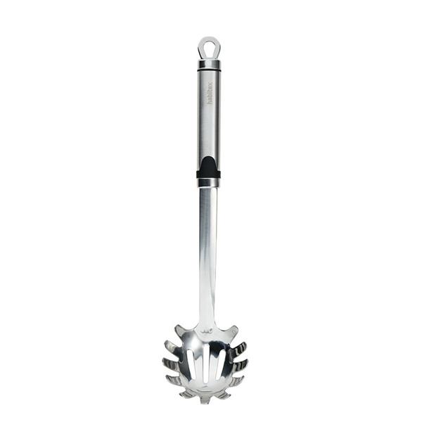 Acero inox de alta resistencia. Mango ovalado con colgador. Aptos para lavavajillas. Sirve spaguetti inox. 33,5 cm.
