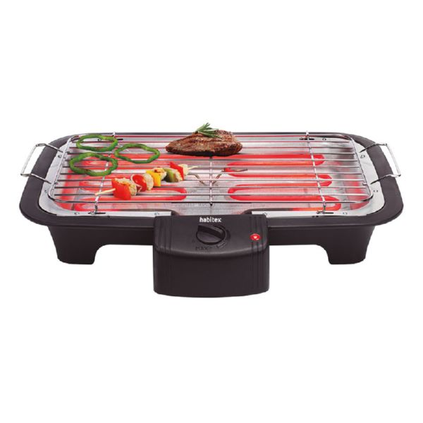 Superficie cocción 38x22 cm. Carcasa de plástico. Regulador de temperatura contínuo y ajustable. Parrilla apta para lavavajillas. Altura ajustable. Bandeja recoge grasa. Asas integradas. 2.000 W.