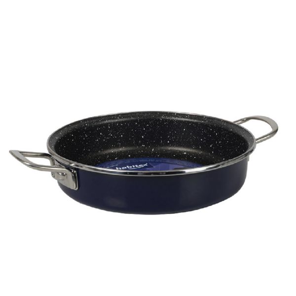 Acero esmaltado vitrificado con recubrimiento antiadherente piedra bicapa, libre PFOA. Mango y asas remachadas de acero inox. Tapadera de cristal con aro metálico. Para todo tipo de cocinas. Apto para lavavajillas. Tartera ø 24 cm.