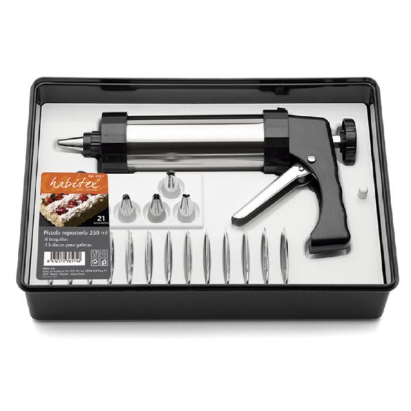 Cuerpo metálico. Estuche 21 accesorios. Pistola 250 ml. 8 boquillas. 13 disco para galletas.
