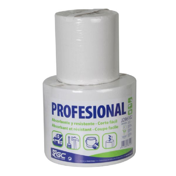 Celulosa reciclada doble capa. Absorvente y resistente. Corte fácil. Sistema unión de capas (ADD System). Mandril extraÃble. 450 servicios.
