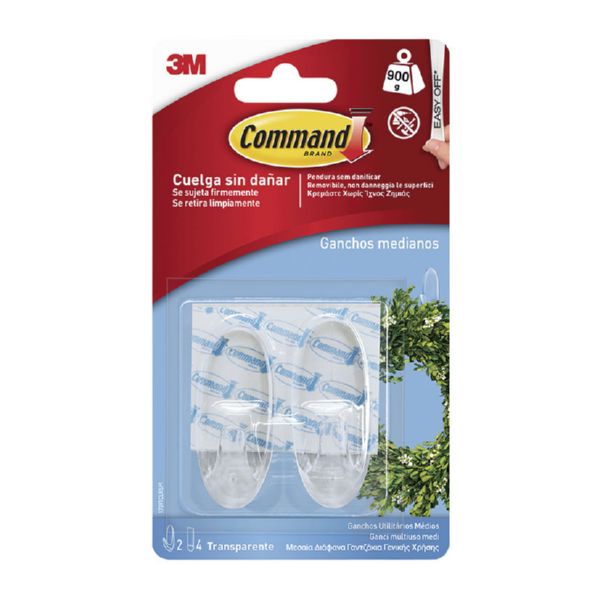 Cintas resistentes al agua. Sin necesidad de hacer agujeros. Se adhiere a multitud de superficies; paredes pintadas. madera, baldosas.... Se retiran limpiamente, sin marcas, sin residuos pegajosos, ni manchas. Reutiliza los ganchos usando las tiras de repuesto. No apto para baños. 2 ganchos medianos + 4 tiras. Soporta 1.4 kg. Transparente. No apto baño.