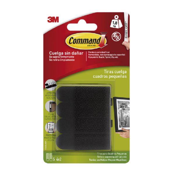 Cintas resistentes al agua. Sin necesidad de hacer agujeros. Se adhieren a multitud de superficies; paredes pintadas, madera, baldosas.Se retiran limpiamente, sin marcas, sin residuos pegajosos, ni manchas. Reutiliza los ganchos usando las tiras de repuesto. Pequeñas. 8 unid. (4 juegos). Marcos 20-25 cm. Soporta 0,5 kg cada juego. Negra.