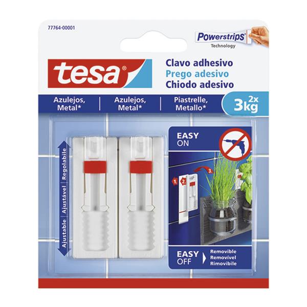 Sin necesidad de hacer agujeros. Enganche fácil y sin dejar residuos al quitarlos. Color blanco. Blíster 2 unidades. Superficies lisas (azulejos y metal). Ajustable. Soporta 3 kg.