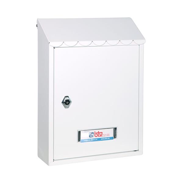 Fabricado en acero galvanizado pintado. Disponible en color blanco y negro. Con tejadillo decorativo. Cerradura de rombo. Dimensiones: 300x210x68 mm. Blanco.