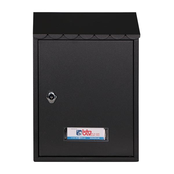 Fabricado en acero galvanizado pintado. Disponible en color blanco y negro. Con tejadillo decorativo. Cerradura de rombo. Dimensiones: 300x210x68 mm. Negro.