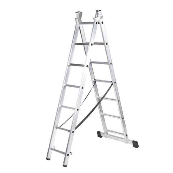 Barra establizadora, conteras PVC. GuÃas exteriores de deslizamiento en aluminio. Cinta de seguridad antiapertuta nilón. 2x7 peldaños.