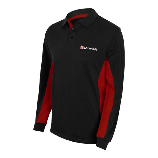 60% poli?ster y 40% algod?n. Color rojo en costadillos e interior de la botonadora y cuello y negro en el resto. Cierre central con botones. Cuello y bajo de la manga de canal?. Logotipo Cadena 88 en el pecho.. Talla S.